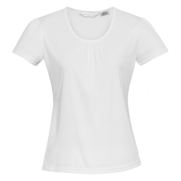 • Features soft gathers at neckline